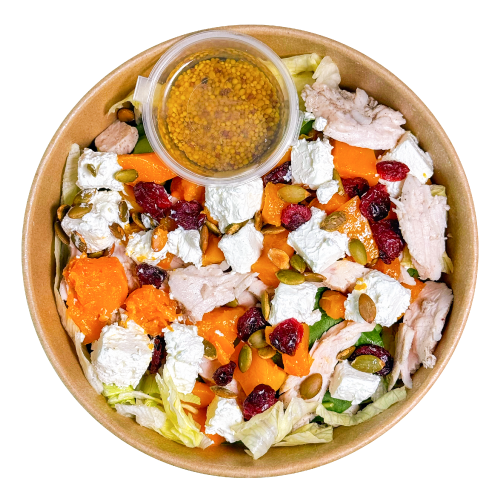 Склад: салат айсберг, бейбі-шпинат, курка су-від, пармезан(тертий), яйце куряче, томат коктейльний, сухарі п/ф, соус Цезар, кунжут. Вага 270г.Термін придатності за температури: від +2°C до +6 °C — 72 години